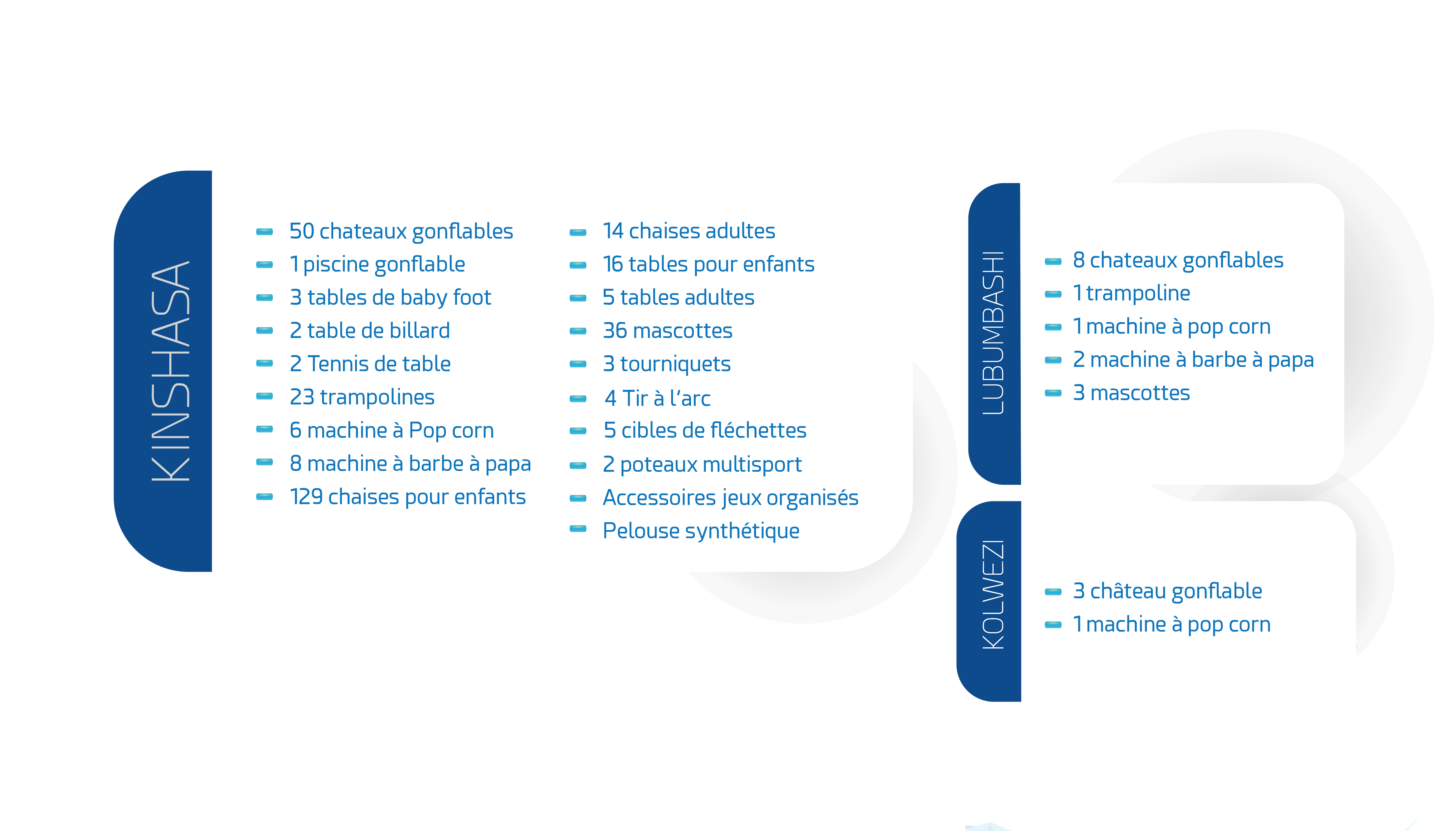 A sa création, Tims a lancé sa boutique en tant que distributeur agréé officiel et dépôt relais de la marque Strong Technologies spécialisée dans la télédistribution à Matadi. En avril 2018, elle a mis en place la location d’équipements et services pour le divertissement des enfants. En 2020, Tims a arrêté la distribution des produits Strong à Matadi pour se concentrer sur l’évènementiel.